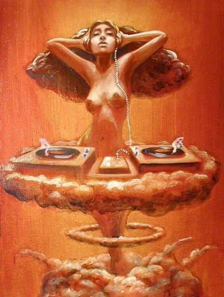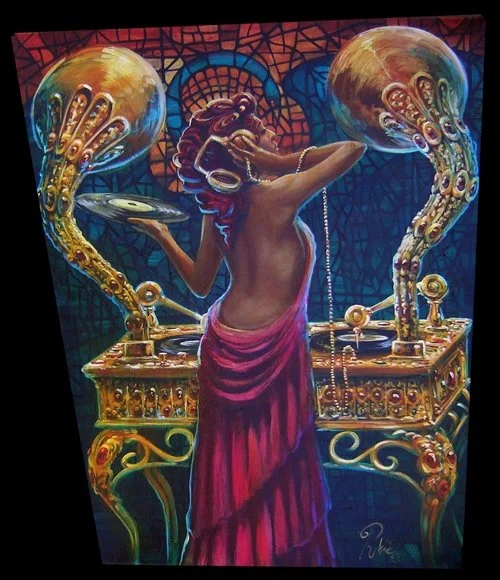 En primer lugar, "lo que" yo pinto, son-como la diosa, el santo-como las mujeres en situaciones o momentos que parecen provenir de algún mito extraño o una historia que usted desea que usted ha oído. Me tire de un aluvión de románticos y "pictóricos" épocas de arte que reflejan nuestra propia: barroco, rococó Ashcan, y Art Nouveau. Estoy muy influenciado por otros medios creativos, incluyendo la película (todo tipo de animación, los años 50, 60'sclassics y documentales sobre la cultura), teatro (Shakespeare, musicales, vanguardistas), música (blues, clásica, hip hop, jazz, folk , y el rock n 'roll) y de la literatura (Twain, Hemingway, y Robbins.) Todos parecen añadir a la colisión de un modo u otro. Me encanta hacer cuadros alegres de corazón - pero irracional. Son como absurdos románticos o adivinanzas bien habladas sin respuesta - anti-narrativas. Por ejemplo, el enigma popular por Lewis Carroll, "¿Por qué se parece un cuervo a un escritorio?". Es una frase hermosa y es un enigma que realmente quieren ver resuelto, pero la respuesta es no, obviamente, la próxima. En cierto modo, ese es el tipo de imagen o escenario que me gustaría crear. Es un equilibrio entre el misterio y la accesibilidad. Mis pinturas se puede ver como algo divertido, divertido, o muy en el exterior, pero esto es sólo una herramienta para atraer a mi público a un mundo de mitos mezclados y emparejados y la cultura, los gags literarias, homenajes a grandes obras de arte, las metáforas sexuales, los actos de la inutilidad manifiesta, comentario social y un lugar donde no hay respuestas claras.